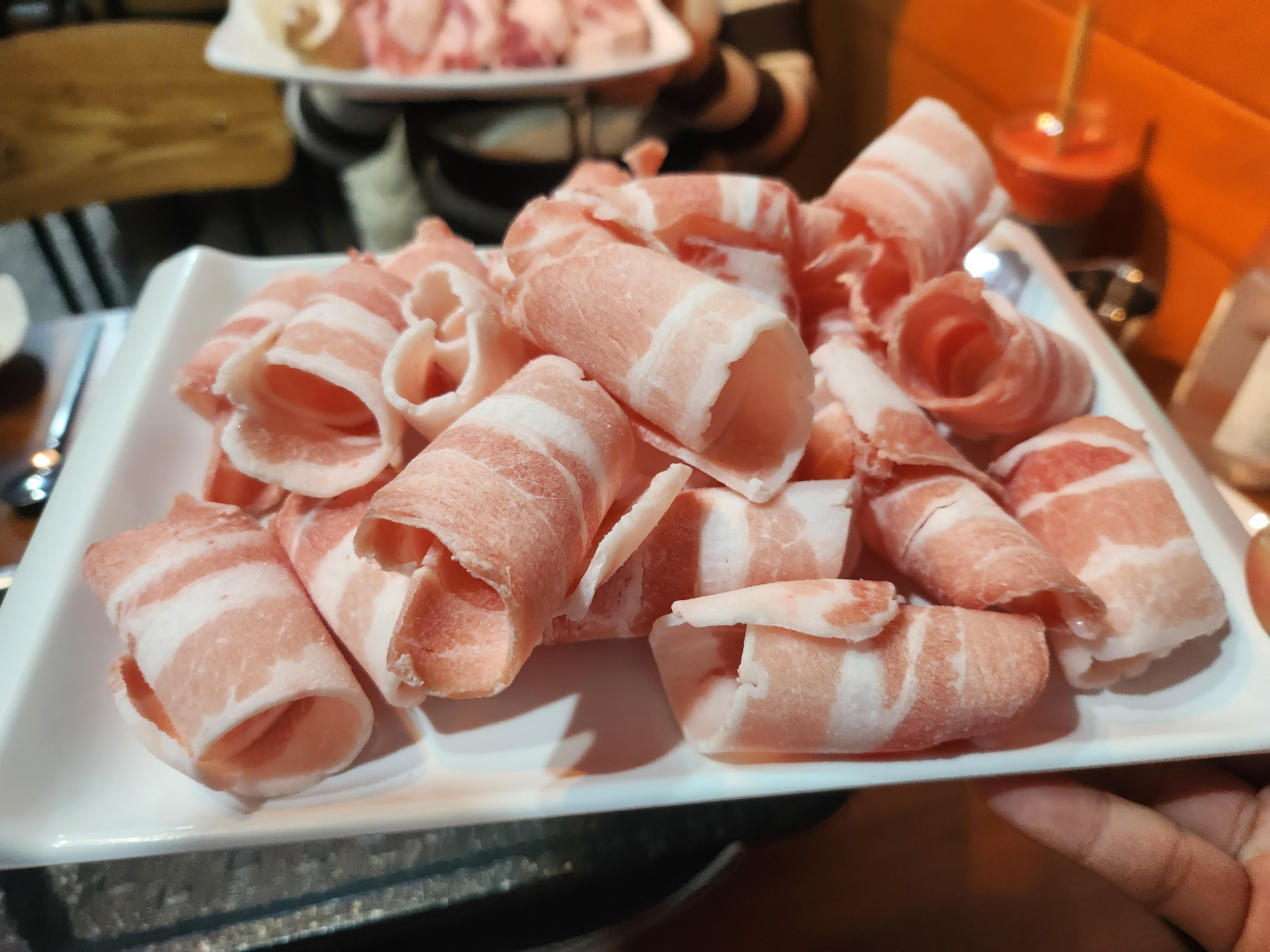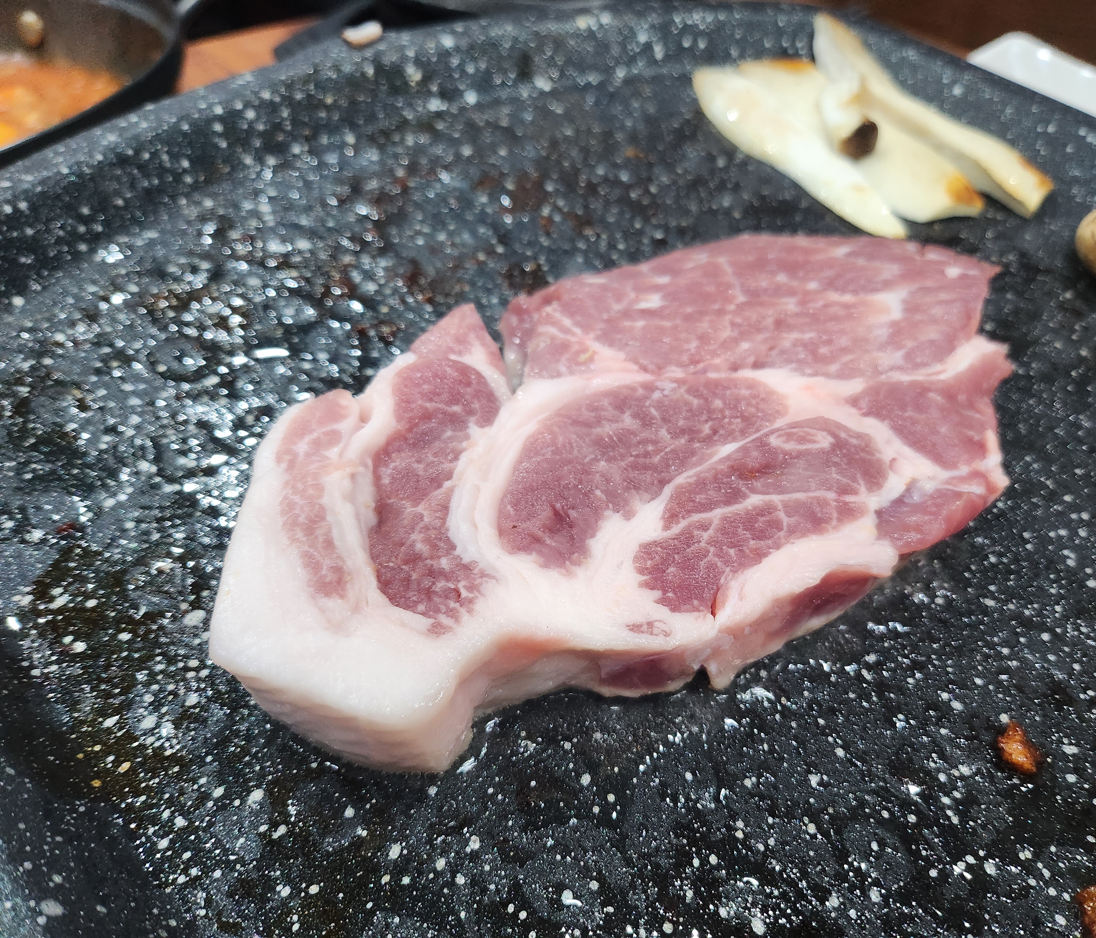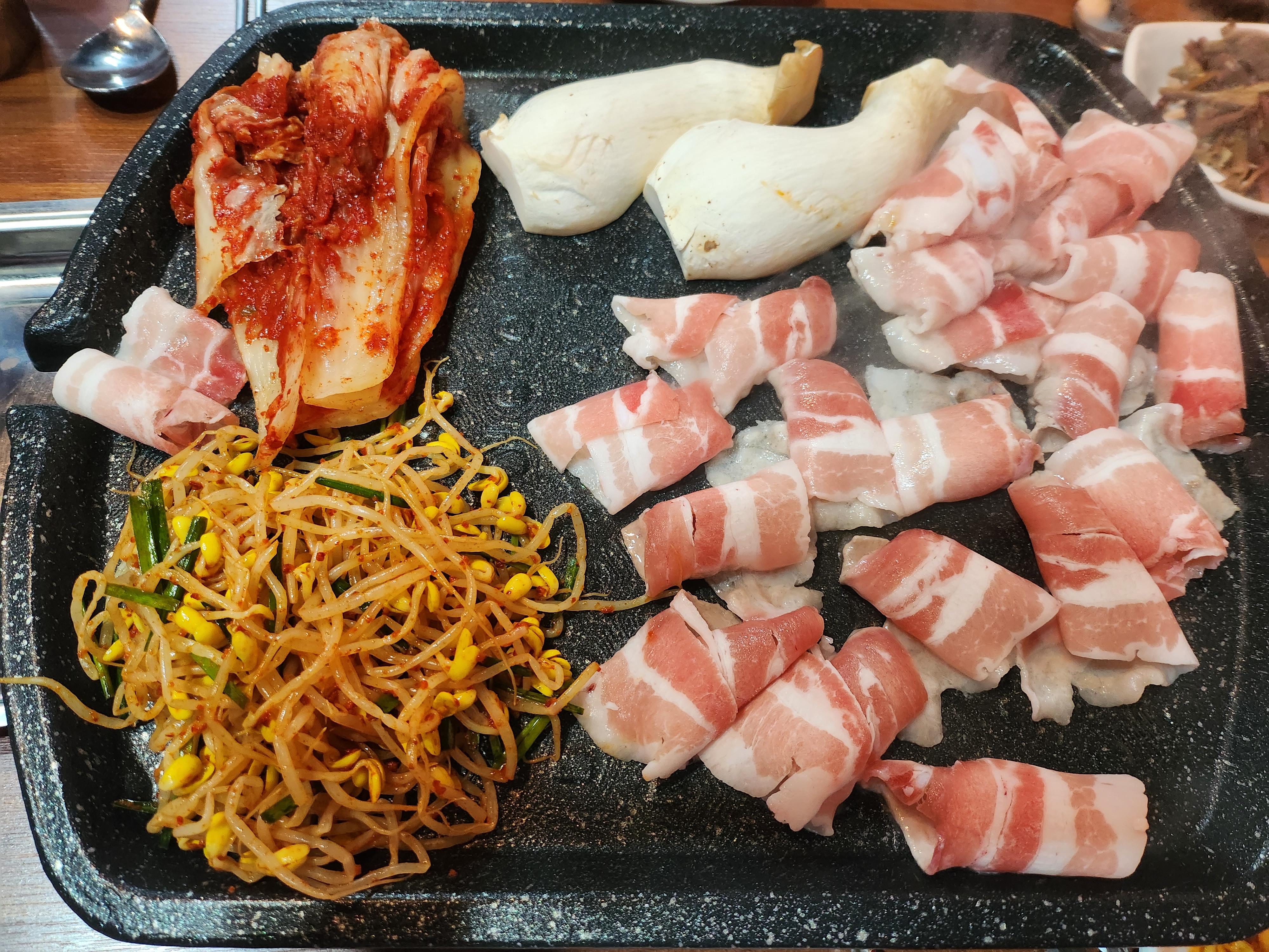 얇은 대패삼겹부터 후딱 올려서 후루룹 먹고 배고픈 속을 달래준 뒤