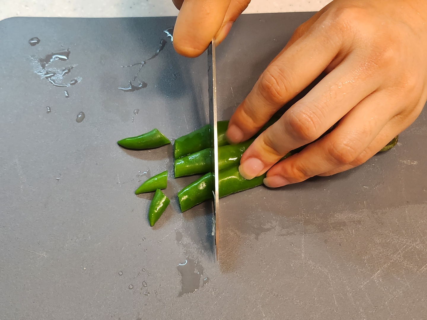 양념장을 다 만들고 바로 양파 1개, 청양고추 3개를 썰어둔다.
