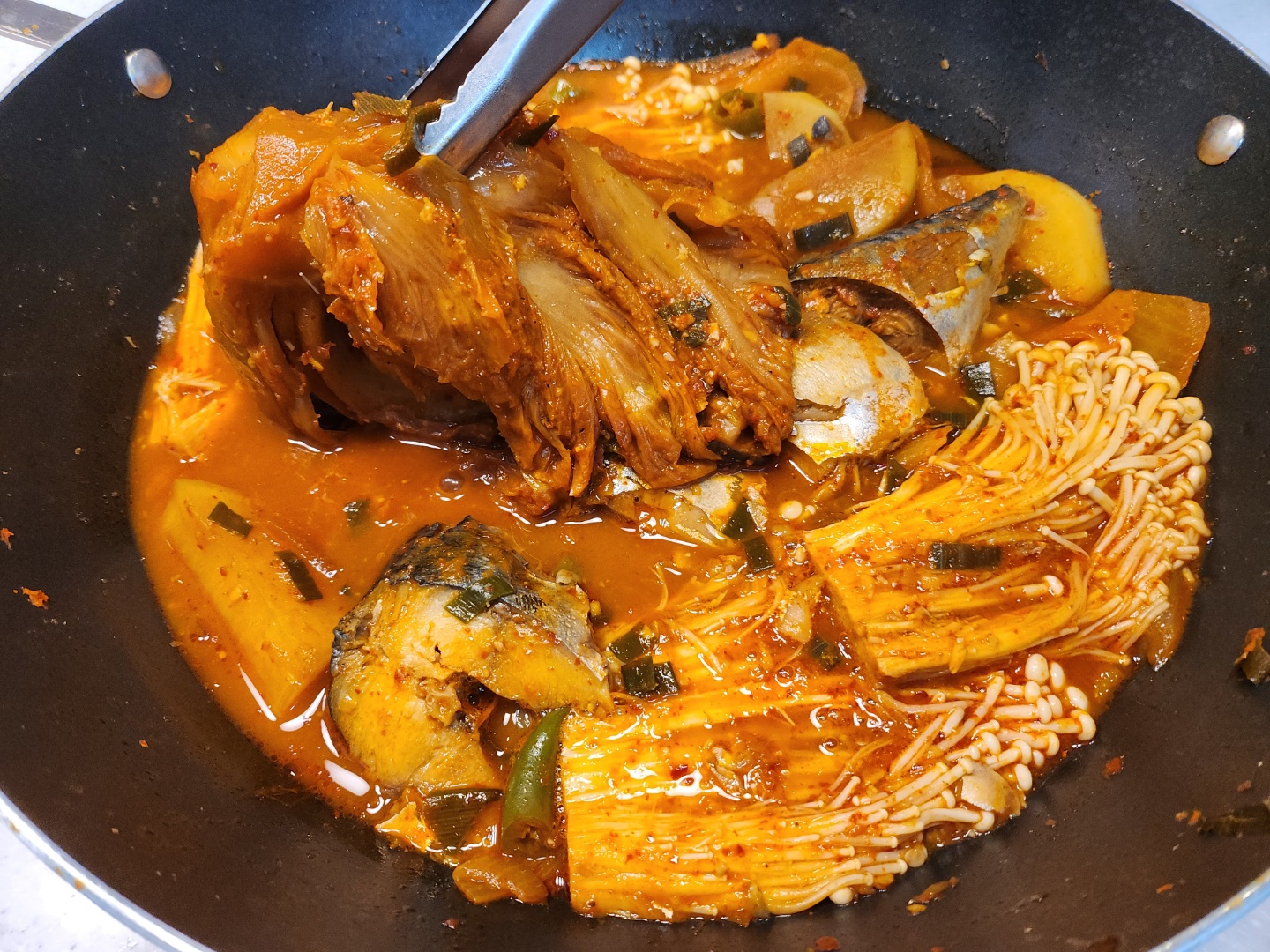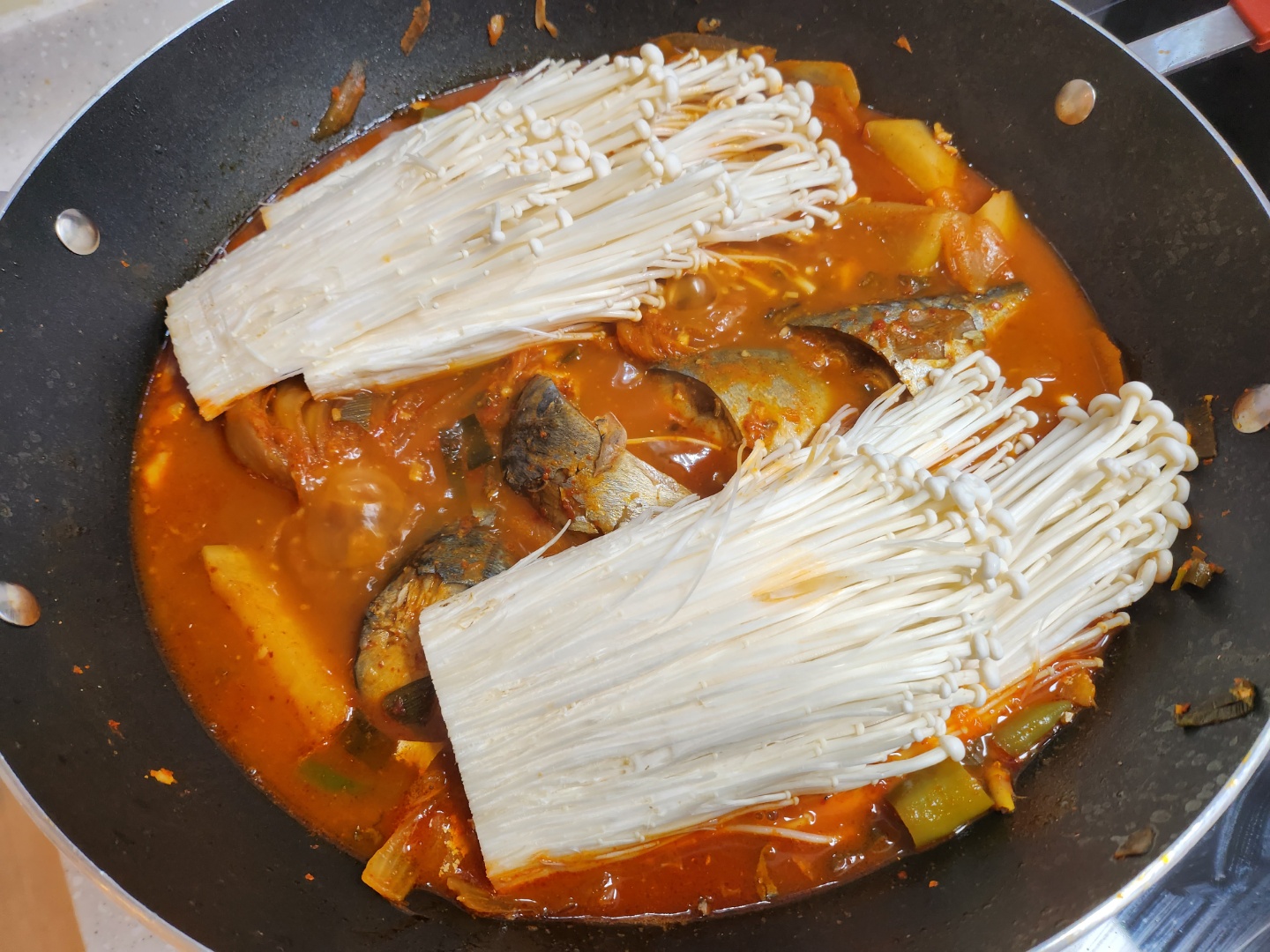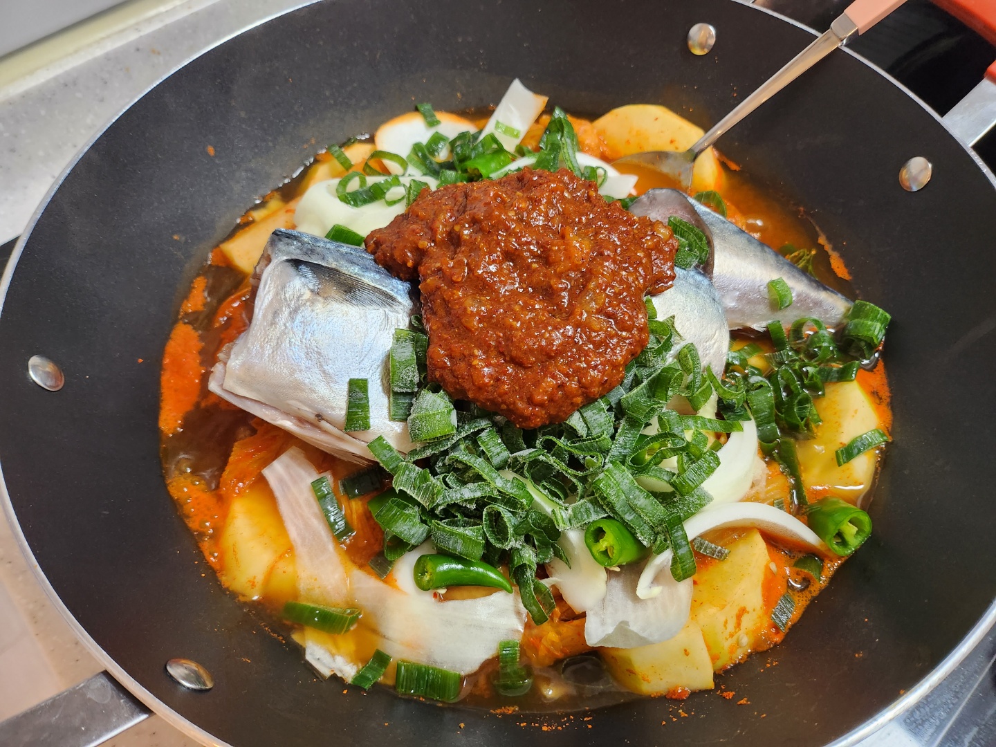 그리고 10분정도 끓인 다시팩은 빼주고 고등어와 양파, 청양고추, 대파, 양념장 순으로 올려준다.