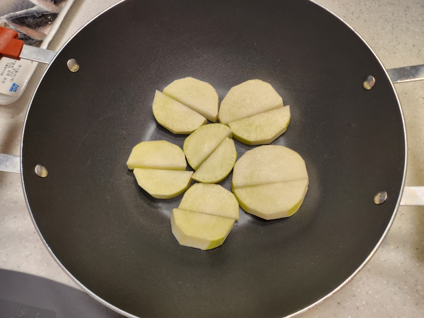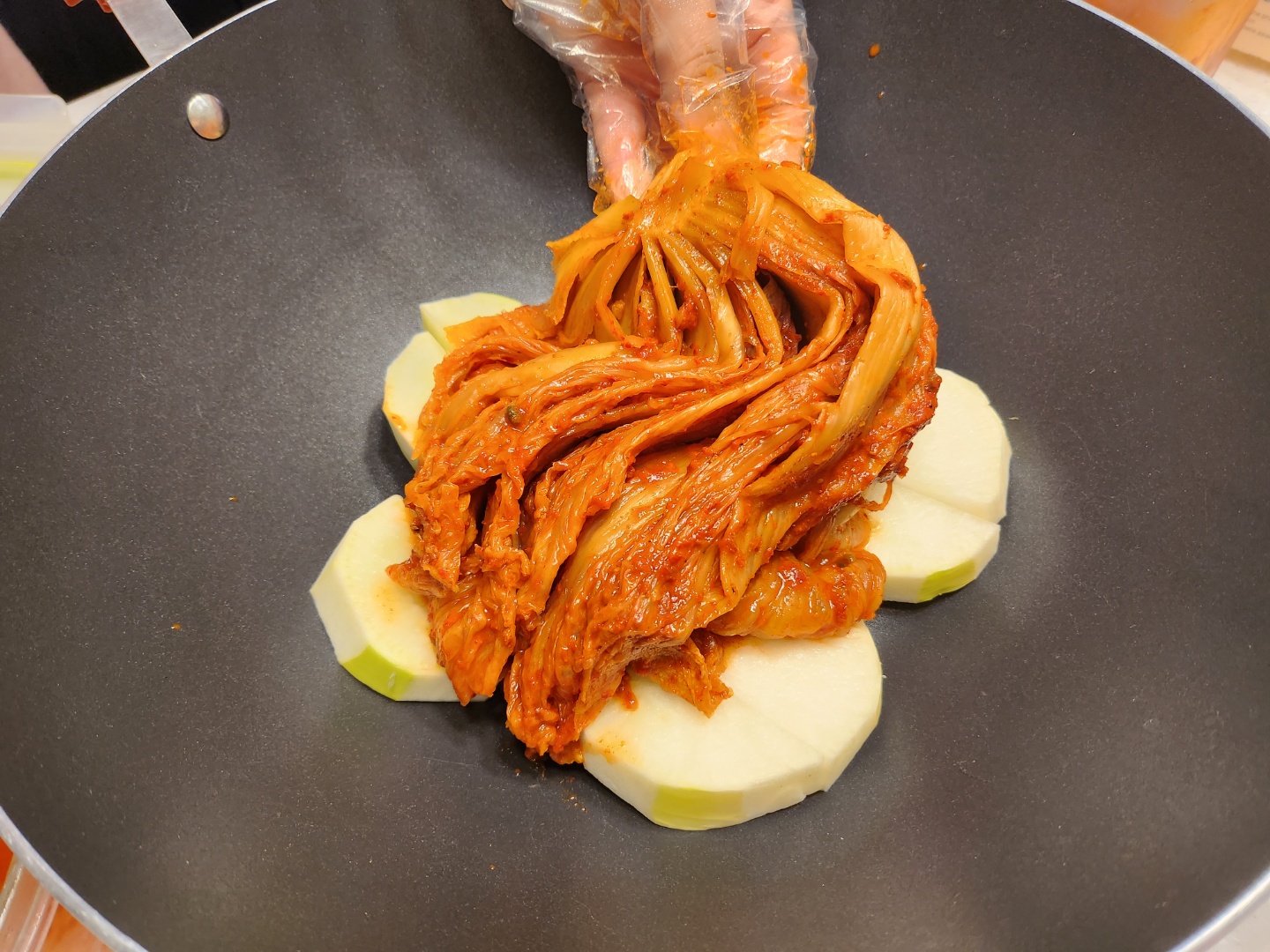 먼저 무를 살짝 두툼하게 썰어 냄비 바닥에 깔아주고