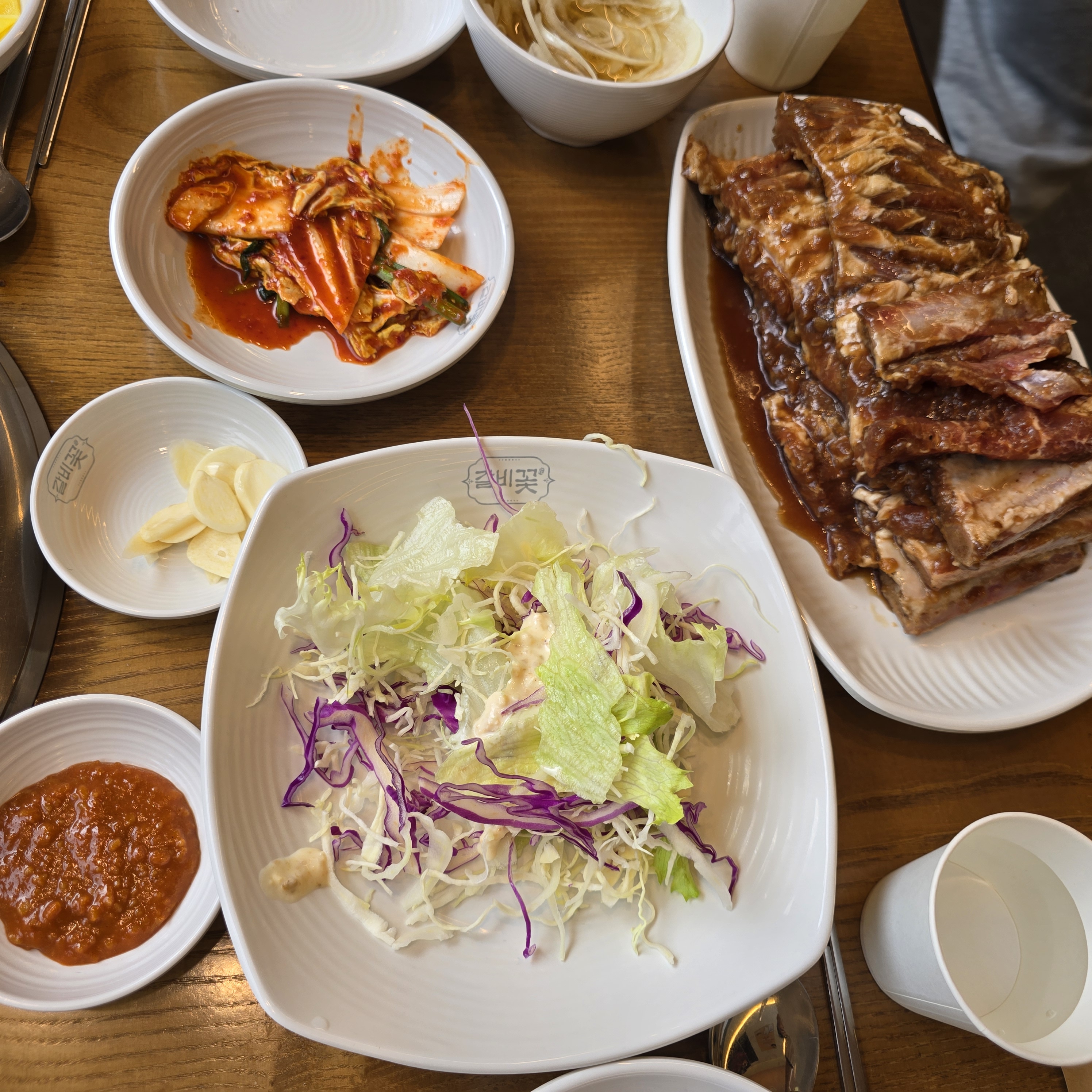 샐러드와 겉절이, 쌈장, 마늘까지 다 나오고 주문한 꽃돼지갈비 4인분도 나왔다!!!