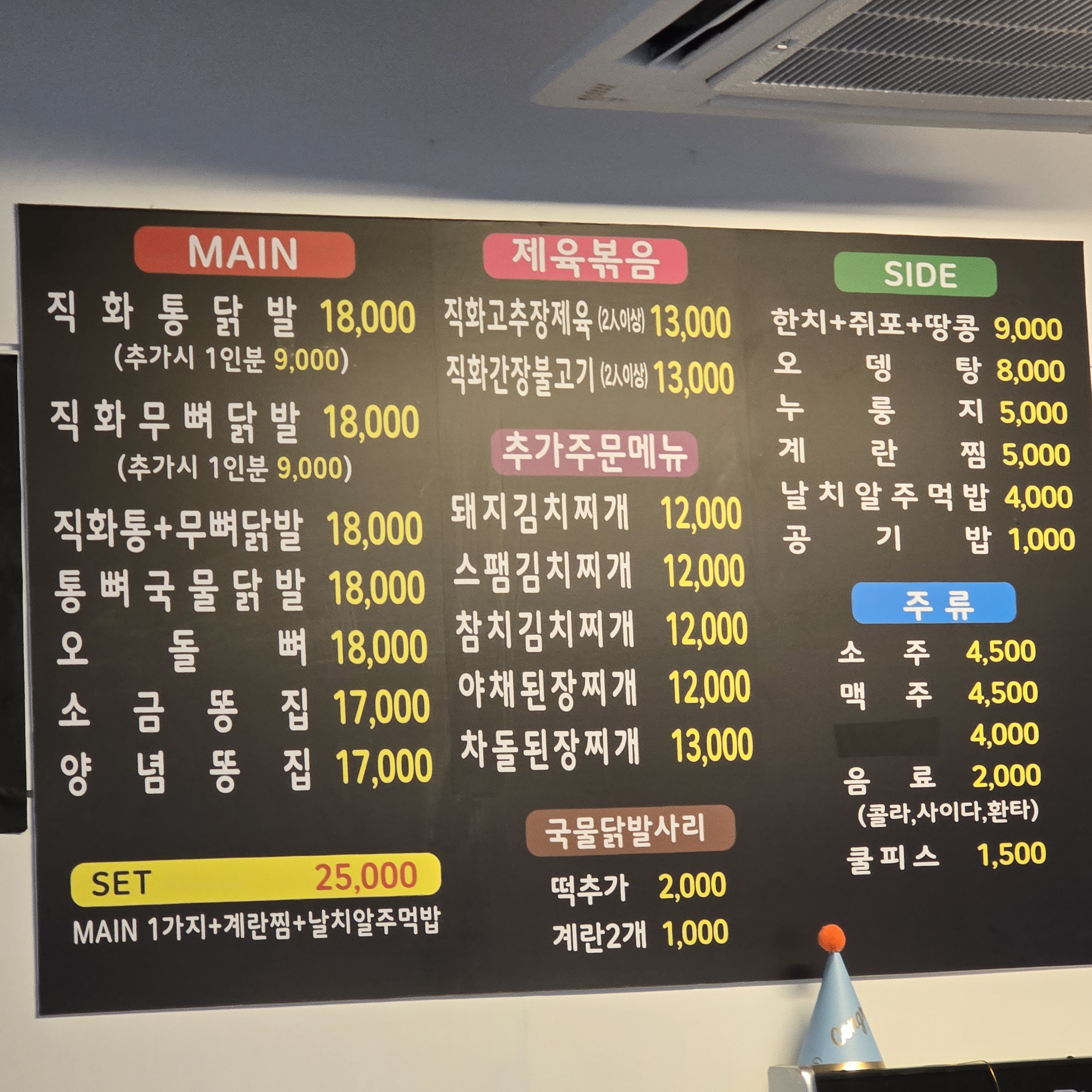 네 명이서 SET 25,000원짜리를 주문했고 메인메뉴로는 국물닭발을 주문했다.