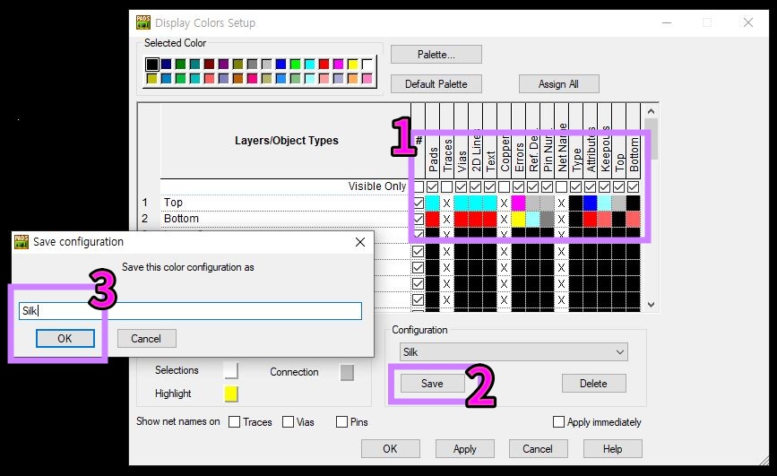 Display Colors Setup에서 층별 컬러를 설정할수도 있지만 후에 Silk 정리할때 필요한 설정도 만들어 둘 수 있다.