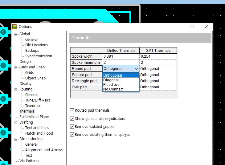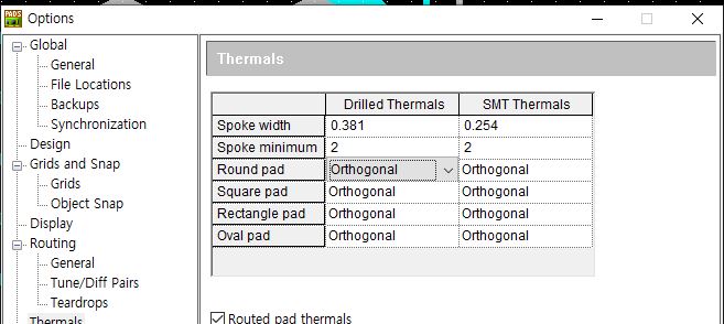 Ctrl+Enter로 옵션창을 켜주고 Thermals에서 Round pad, Square pad, Rectangle pad, Oval pad를