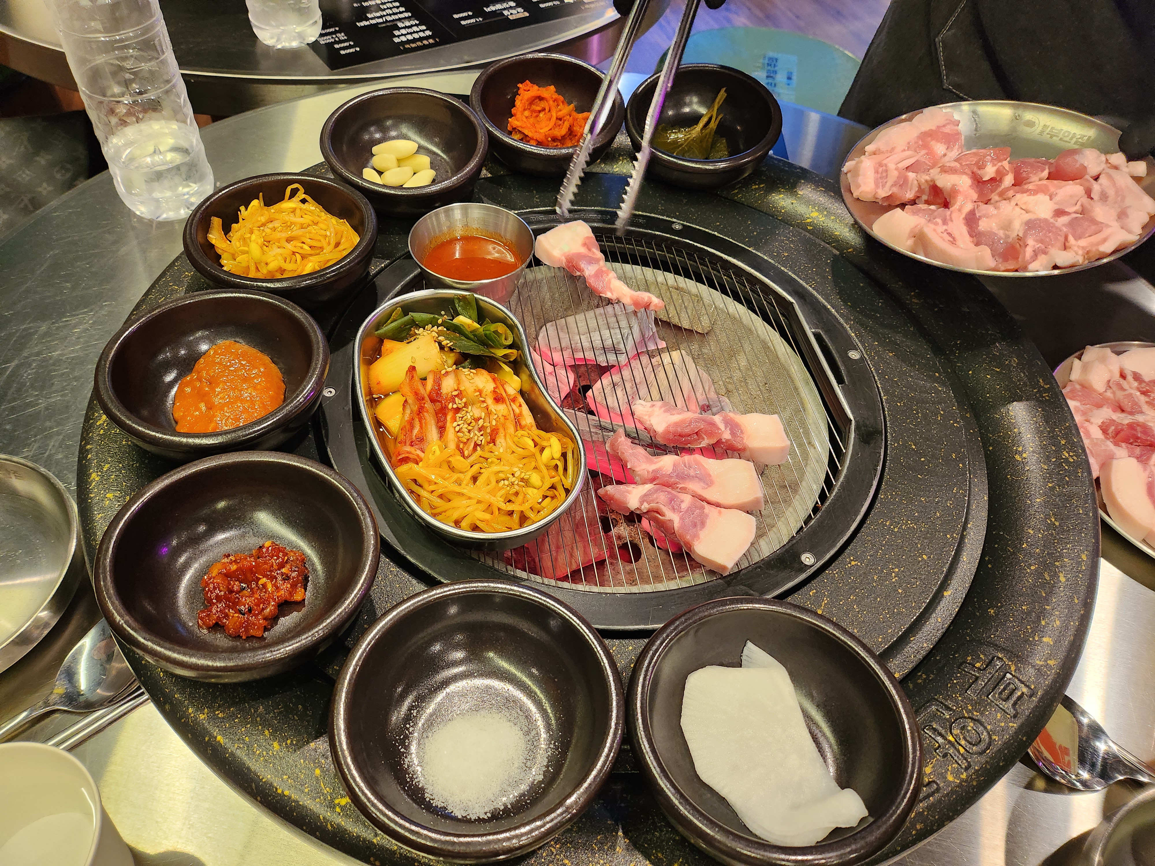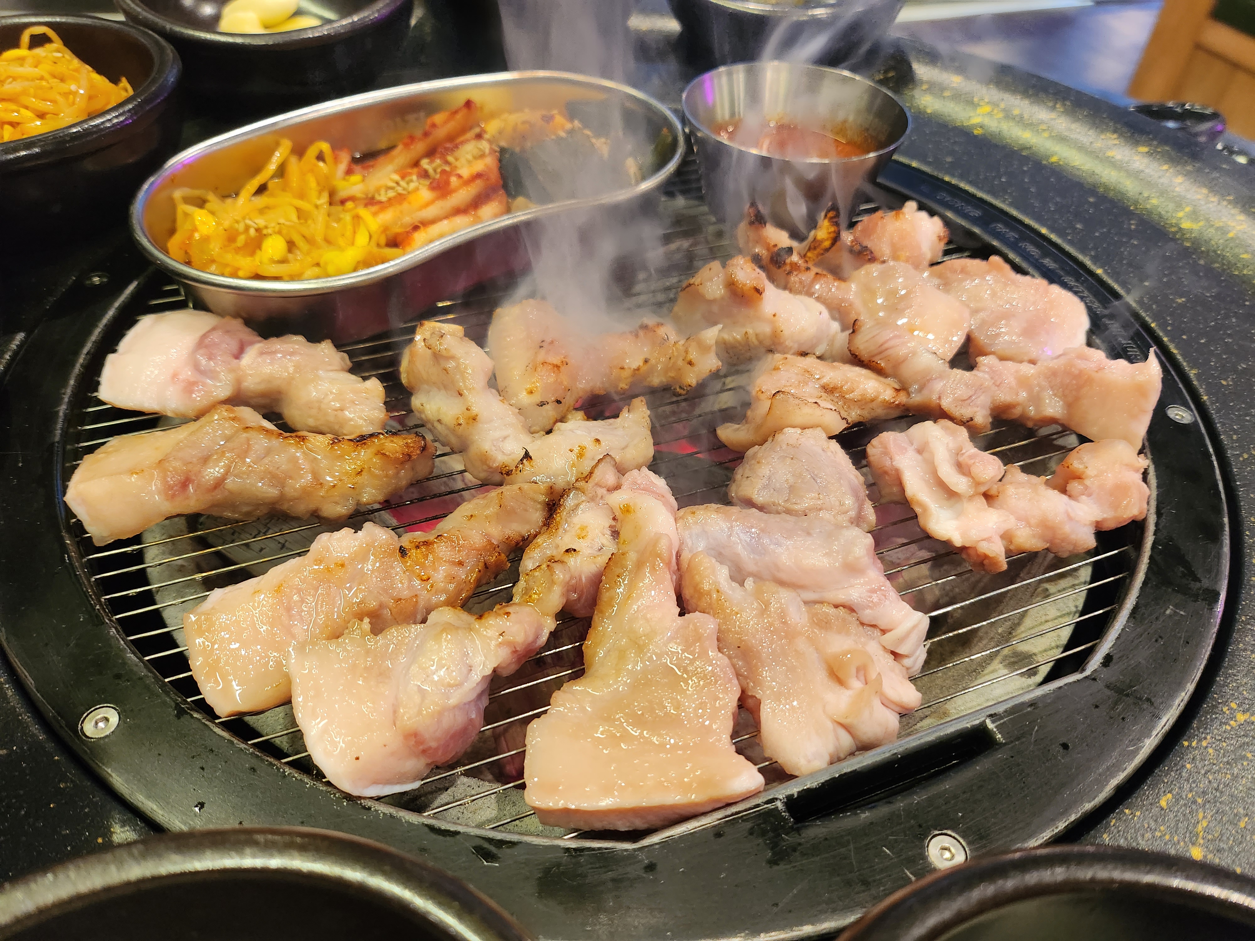 반찬들이 위에 둘러있고, 고기가 익으면 저위에 빼두었다.ㅎㅎ