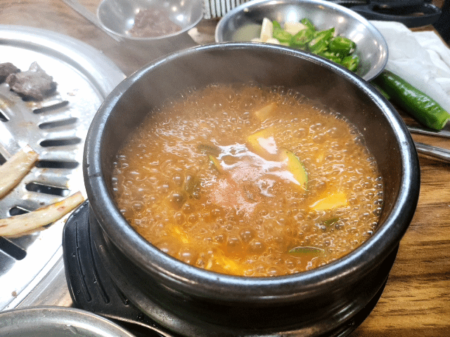 아 고기를 주문할 때 서비스 고추장찌개와 된장찌개 둘 중 하나를 고르라 하시는데