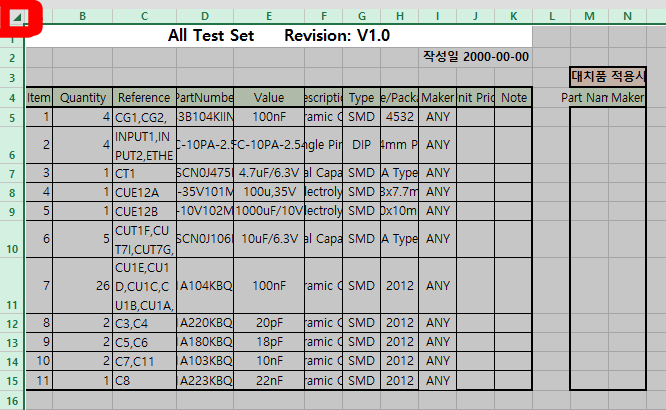 1. 엑셀 좌측 상단에 표시된 부분을 누르면 엑셀 전체가 선택 된다.